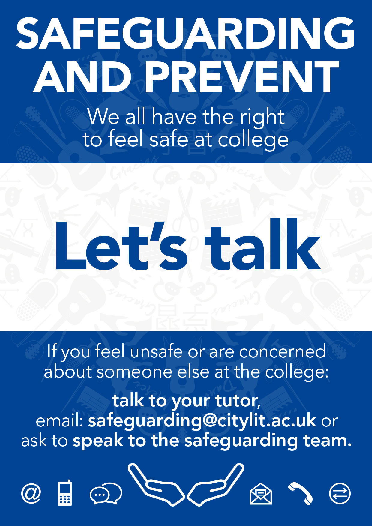 Please talk to your tutor, email safeguarding@citylit.ac.uk or ask to speak to the safeguarding team, if you feel unsafe or are concerned about safety of someone else at the college. If you are concerned that someone else is being bullied, harassed, abused, or even neglected, just let us know.