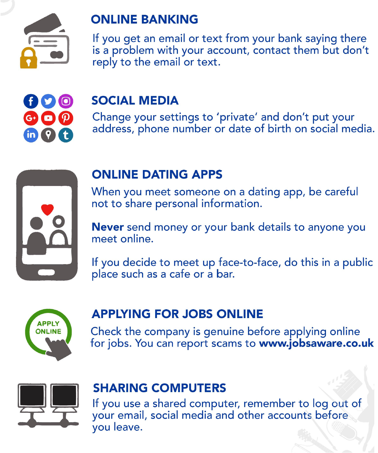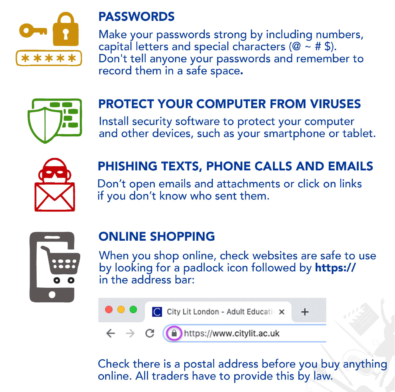 Our guide will help you to make sure you, your computer and your money stay safe when you go online. You can download the full document at the bottom of this page, or click on the images to make them larger.
